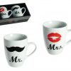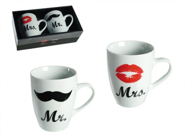 Zestaw 2 kubków z nadrukowanymi napisami Mr. i Mrs. oraz odpowiednio do napisu nadrukowane są wąsy oraz usta. Świetny pomysł na kubki dla Młodej Pary oraz w pełni do użycia na codzień. Całość zapakowana w zgrabne pudełko.