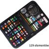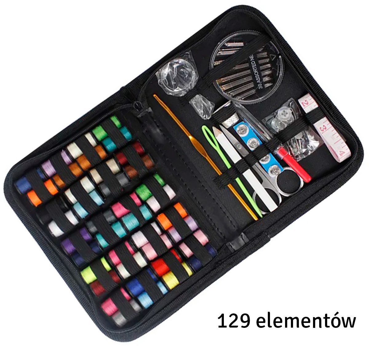 Kompletny zestaw do szycia wyposażony w aż 129 elementów. Doskonały prezent dla amatorów krawiectwa. Wszystkie akcesoria zostały wykonane z solidnych materiałów i doskonale leżą w dłoni, przez co nadają się również dla profesjonalistów. W praktycznym etui zapinanym na zamek błyskawiczny znalazło się miejsce dla szeregu akcesoriów (igły, nici, agrafki, nożyczki, miarka itp.).